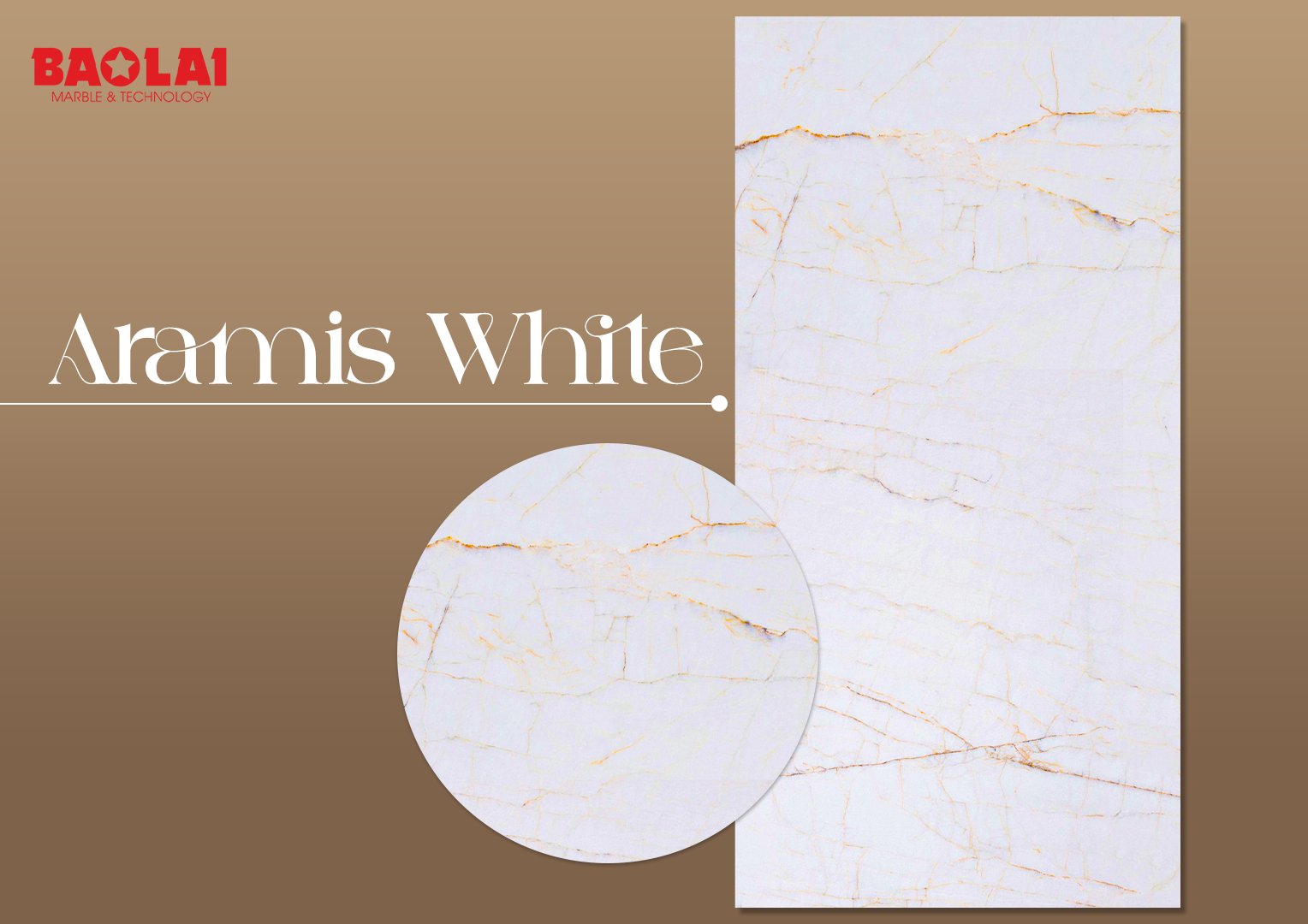 Đá cẩm thạch Aramis White – Bảo Lai là một trong những dòng đá tự nhiên nổi bật với nền trắng tinh khiết kết hợp cùng những đường vân rạn màu vàng nâu tự nhiên. Các đường vân chạy xuyên qua bề mặt đá giống như những vết nứt thời gian, tạo nên vẻ đẹp vừa mạnh mẽ vừa mềm mại, vừa tự nhiên vừa mang tính nghệ thuật.