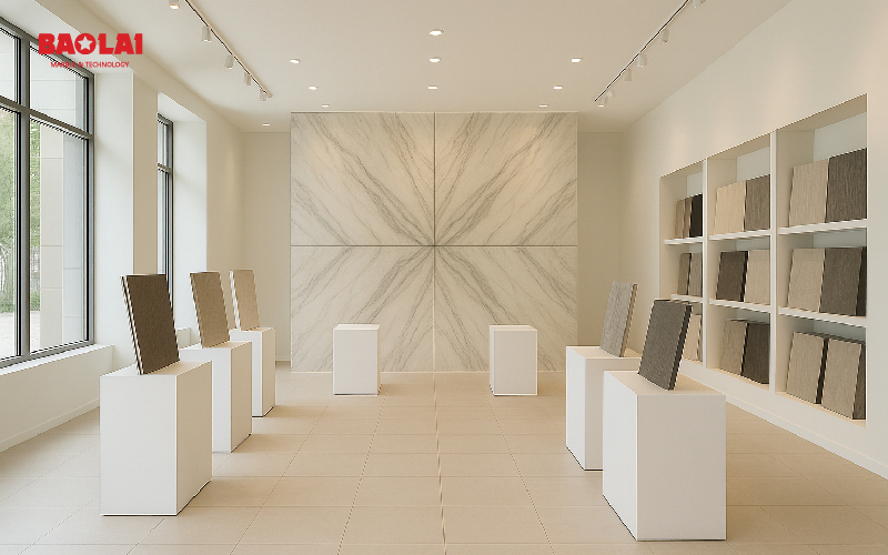 1) Bookmatch vân dọc – Kéo cao showroom