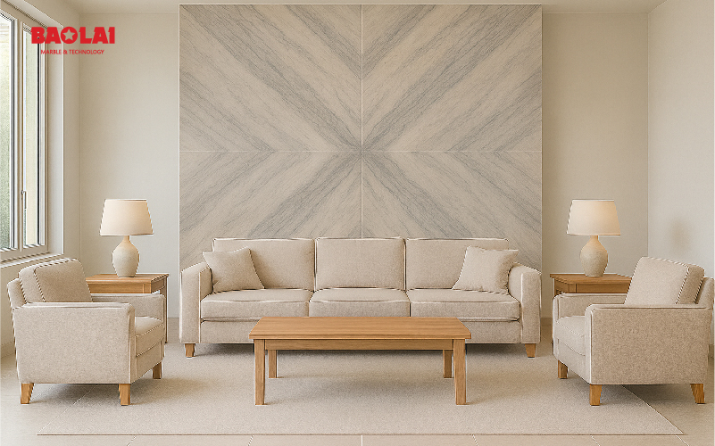 Khác lobby, phòng khách là không gian sinh hoạt hằng ngày → cần bookmatch vừa sang vừa nhẹ.