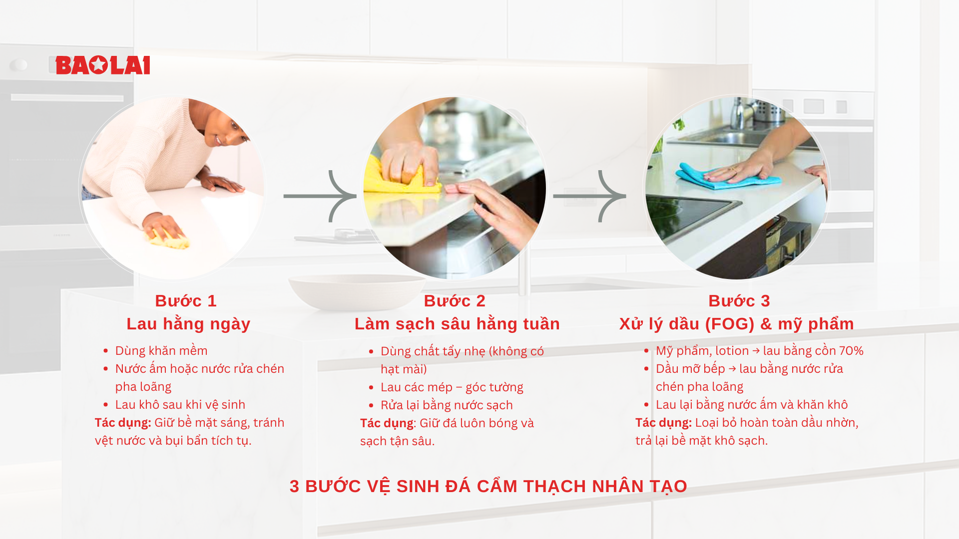 Dưới đây là 3 bước đơn giản giúp bề mặt đá luôn sạch và bền: